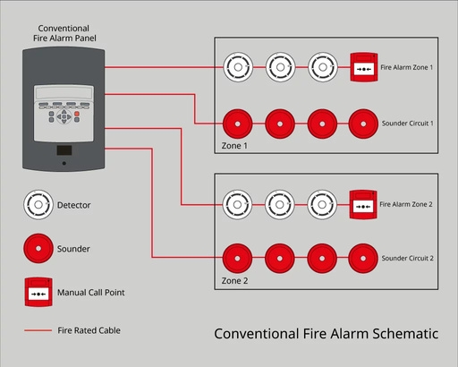 A conventional fire alarm system is a reliable and cost-effective solution for fire detection, commonly used in small to medium-sized buildings. In this system, detectors and call points are grouped into zones, and when an alarm is triggered, the control panel indicates the affected zone.
